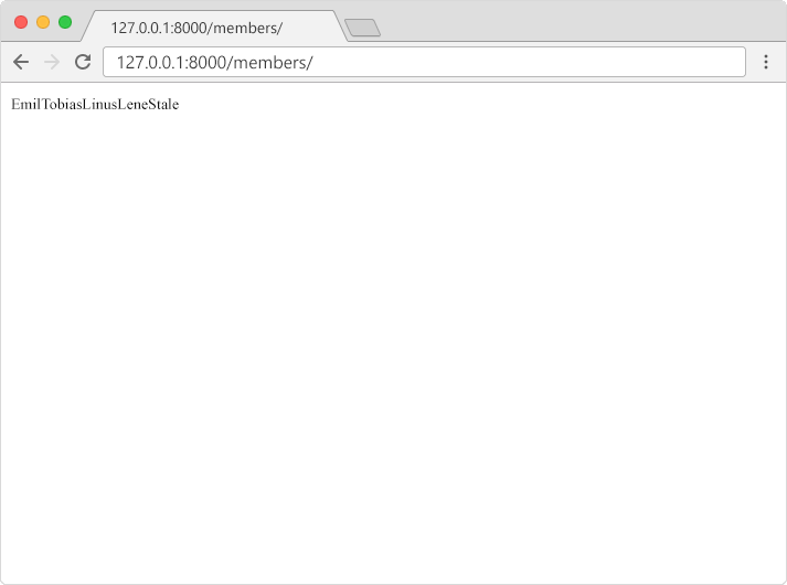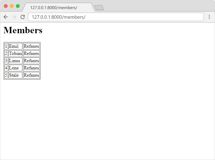 In the browser window, type 127.0.0.1:8000/members/ in the address bar.