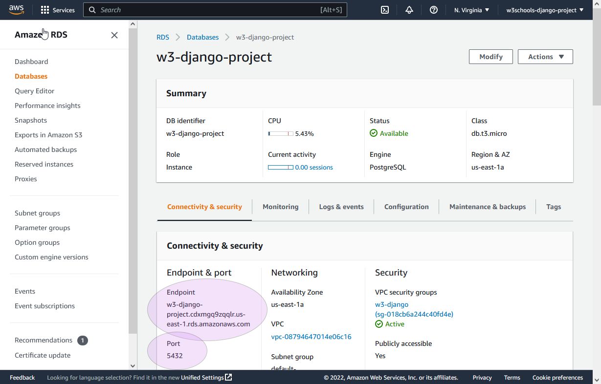 'HOST': 'w3-django-project.cdxmgq9zqqlr.us-east-1.rds.amazonaws.com'