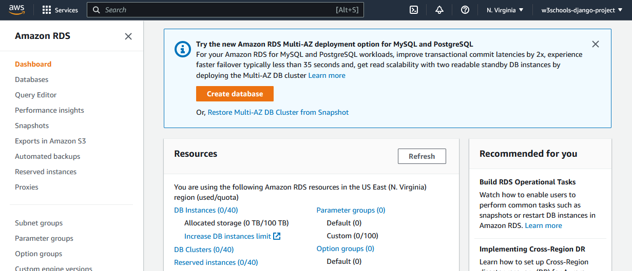 Inside the RDS service, create a database, either by navigating to the Database section, or just click the "Create database" button: