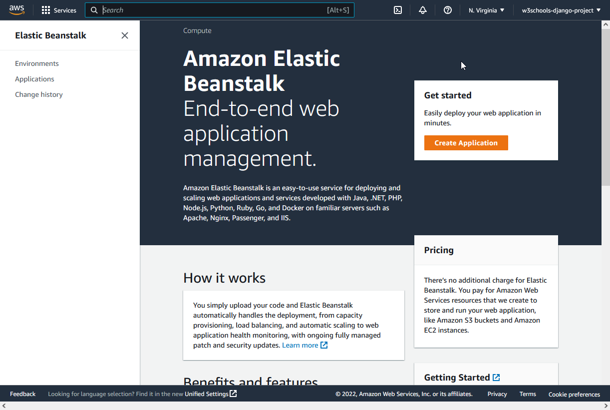 In AWS, navigate to the Elastic Beanstalk application, as we did in the Choose Provider chapter, and click the "Create application" button: