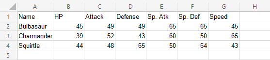 Lets compare the stats for the Pokemons; Charmander, Squirtle and Bulbasaur using a column chart.