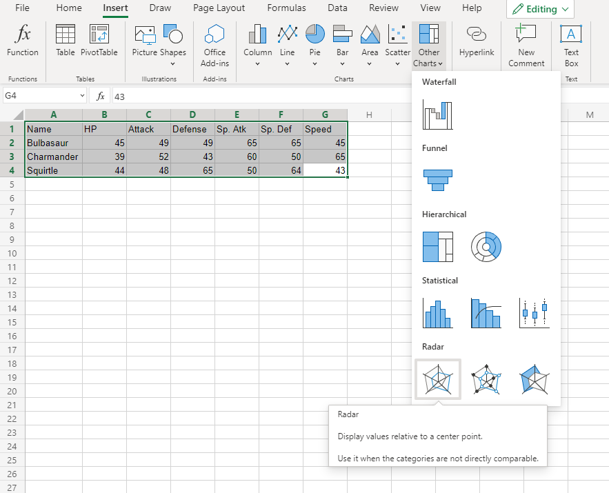 Note: Radar chart is also known as web chart, spider chart and star chart.