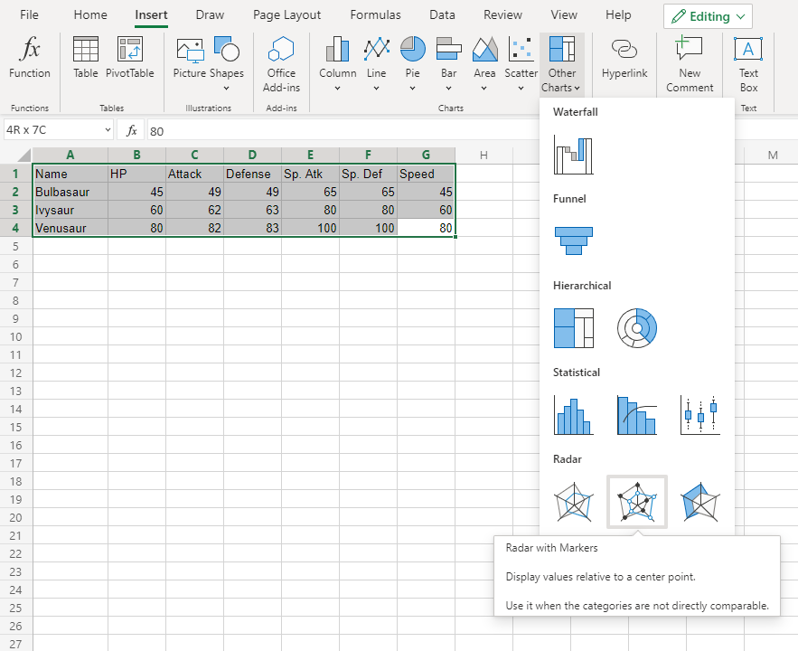 Caution: It's better to avoid using filled radar charts with multiple data columns because some data columns can overshadow others.