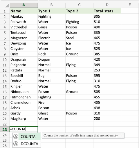 Apply the =COUNTA function to range A2:A21, counting Pokemons by their names, which are letters only: