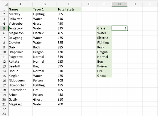 We want the COUNTIF function to count the types of Pokemons, in the range G5:G15: