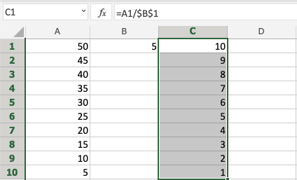 Goob job! You have successfully used absolute reference to divide B1(5) with the range A1:A10.