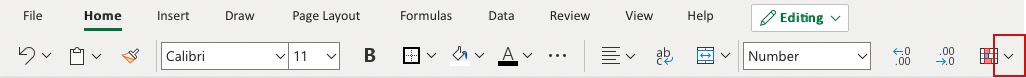 The Ribbon can be expanded by clicking the arrow/caret-down icon on the right side. This gives access to more commands: