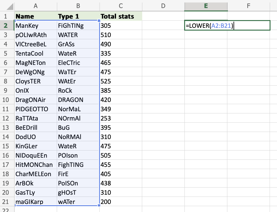 Step 3) Define the range to use the LOWER function on multiple cells