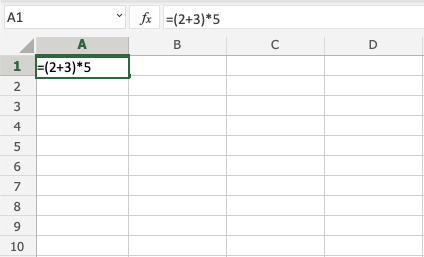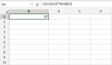 Note: Cells can be used as values in the formulas inside parentheses, like =(A1+A2)*B5. We have used manual entries in our examples to keep things simple.