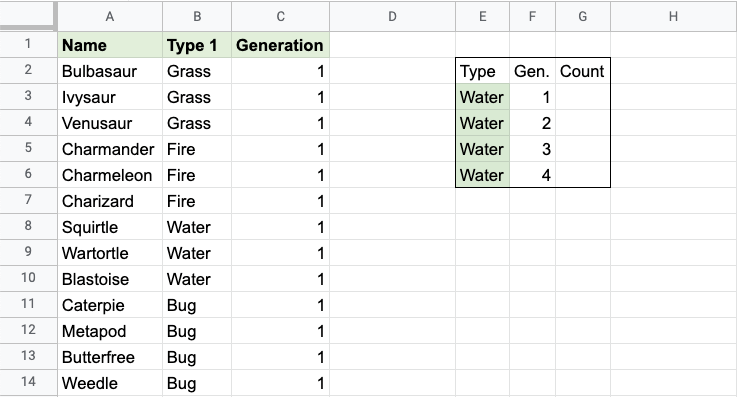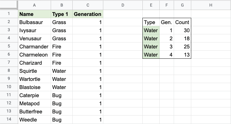 The conditions are that the type is "Water" and Generation is 1.