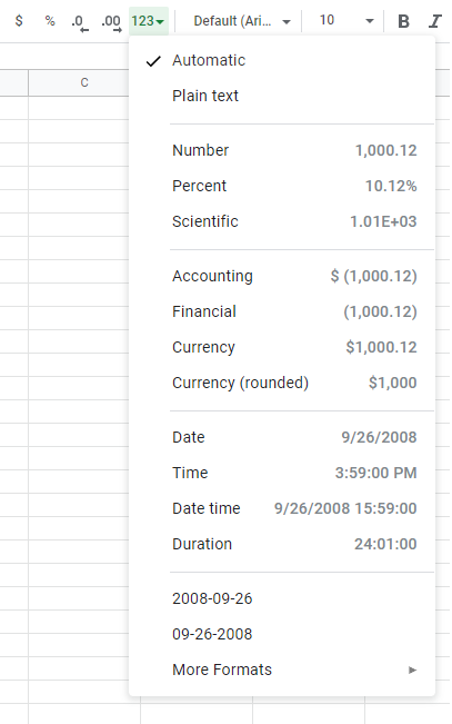 Number formats can be changed by clicking the Number format dropdown (