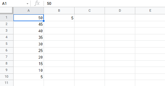 Let's have a look at an example where we multiply B1(5) with the range A1:A10 using absolute reference and the fill function.