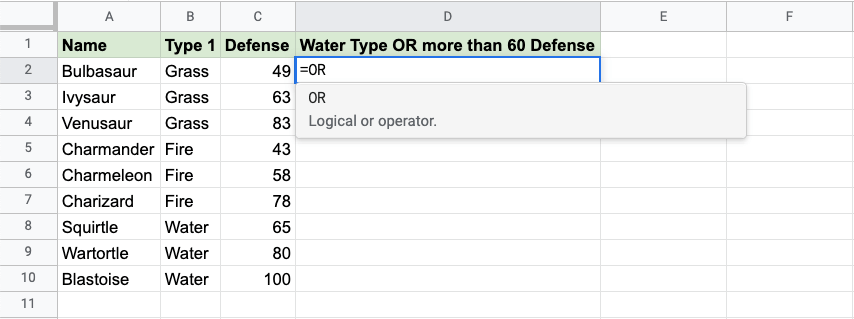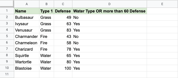 Now, each row has a check for Water Type or Defense greater than 60:
