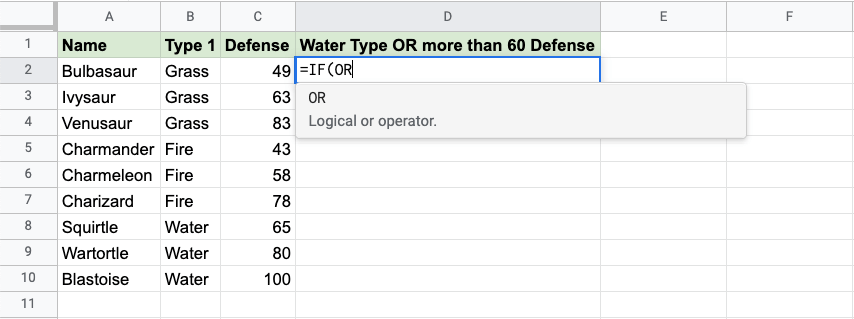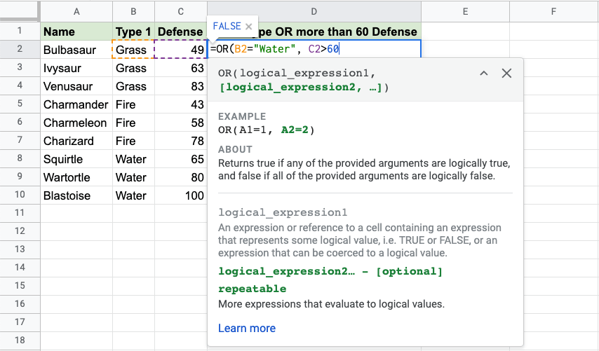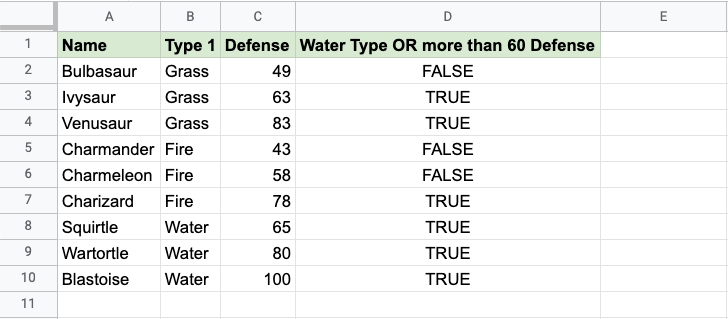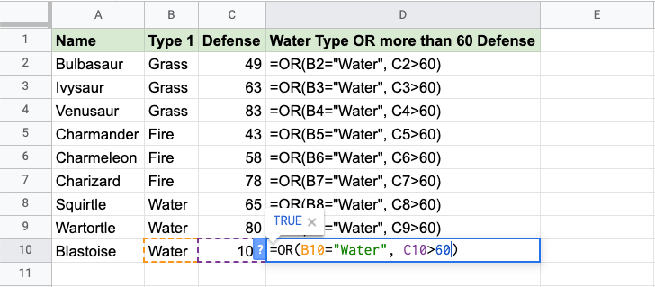 - Wartortle is both Water type and has more than 60 defense, so the function returns "TRUE"
