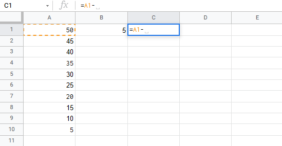 You got it! You have successfully used absolute reference to subtract B1(5) from the minuend range A1:A10.