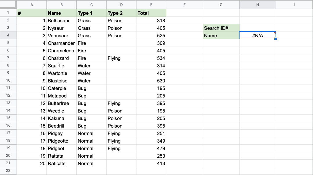 Let's switch the labels, and try to enter Caterpie into the cell H3, where the vlookup functions finds the search_key: