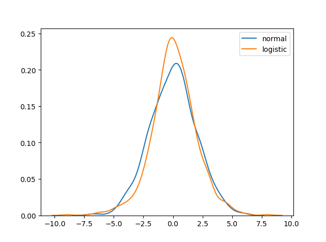 For higher value of scale (standard deviation) the normal and logistic distributions are near identical apart from the peak.
